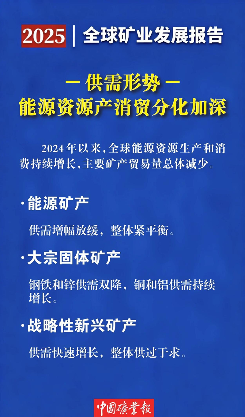 供需方面,《報告》顯示,全球能源資源生產(chǎn)和消費持續(xù)增長,供需結構矛盾加劇。其中,能源礦產(chǎn)供需增幅放緩,整體處于緊平衡。大宗固體礦產(chǎn)中,鋼鐵供需雙降,供應過剩程度增加;銅供需持續(xù)增長,供應缺口擴大;鋁供需雙升,供應過剩程度減小;鋅供需雙降,轉向供不應求。戰(zhàn)略性新興礦產(chǎn)供需快速增長,均表現(xiàn)為供過于求。貴金屬礦產(chǎn)中,黃金供需雙升,但供過于求;白銀供降需增,供應缺口維持高位;鉑金供需雙升,供不應求格局加深。農(nóng)用礦產(chǎn)供需雙升,鉀肥供應過剩程度增大而磷肥減小。